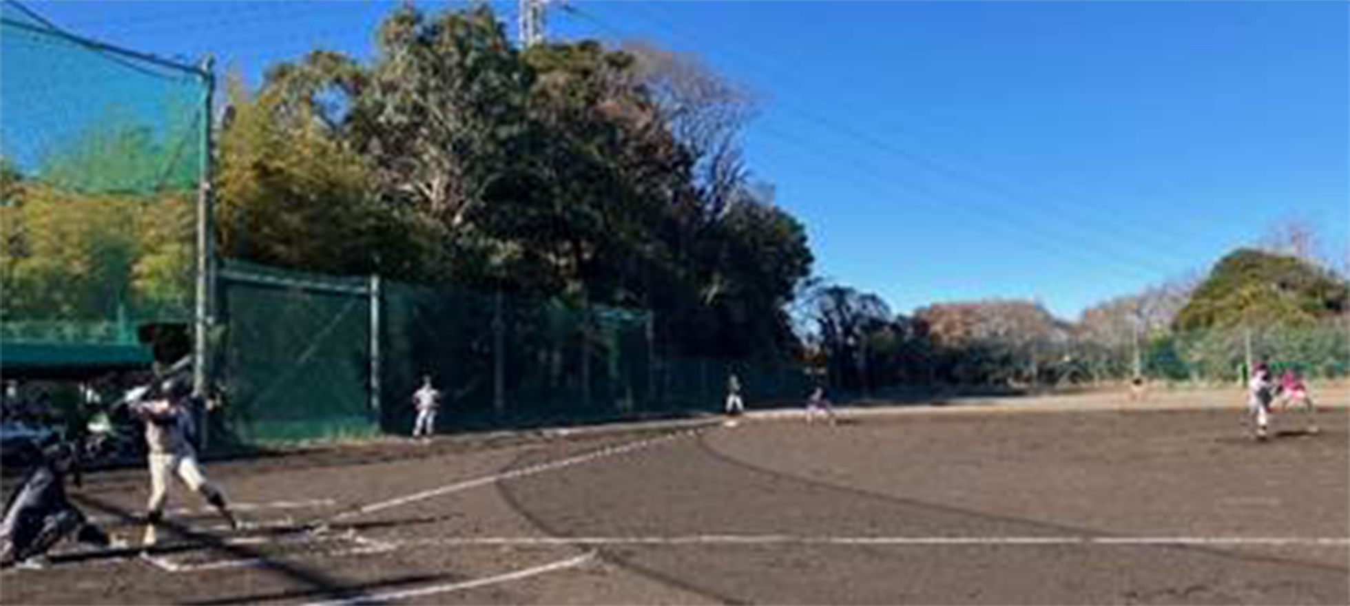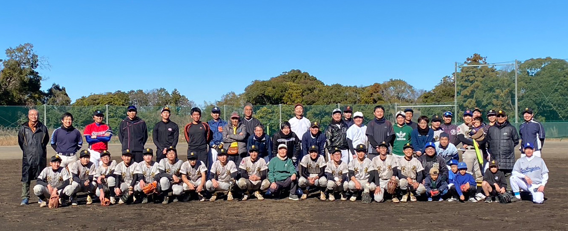 前夜にかなり強いみぞれが降ったので、グランドコンディションが心配でしたが、幸い影響はなく、雲一つない晴天の下で野球に興じることができました。OB31名とその家族6名、吉田先生、関東大会に出場した選手を多く含む現役選手14名の総勢50名のオール栄光野球部が懐かしのグランドに集合し、10時に花井会長(12期)の挨拶のもと試合を開始しました。