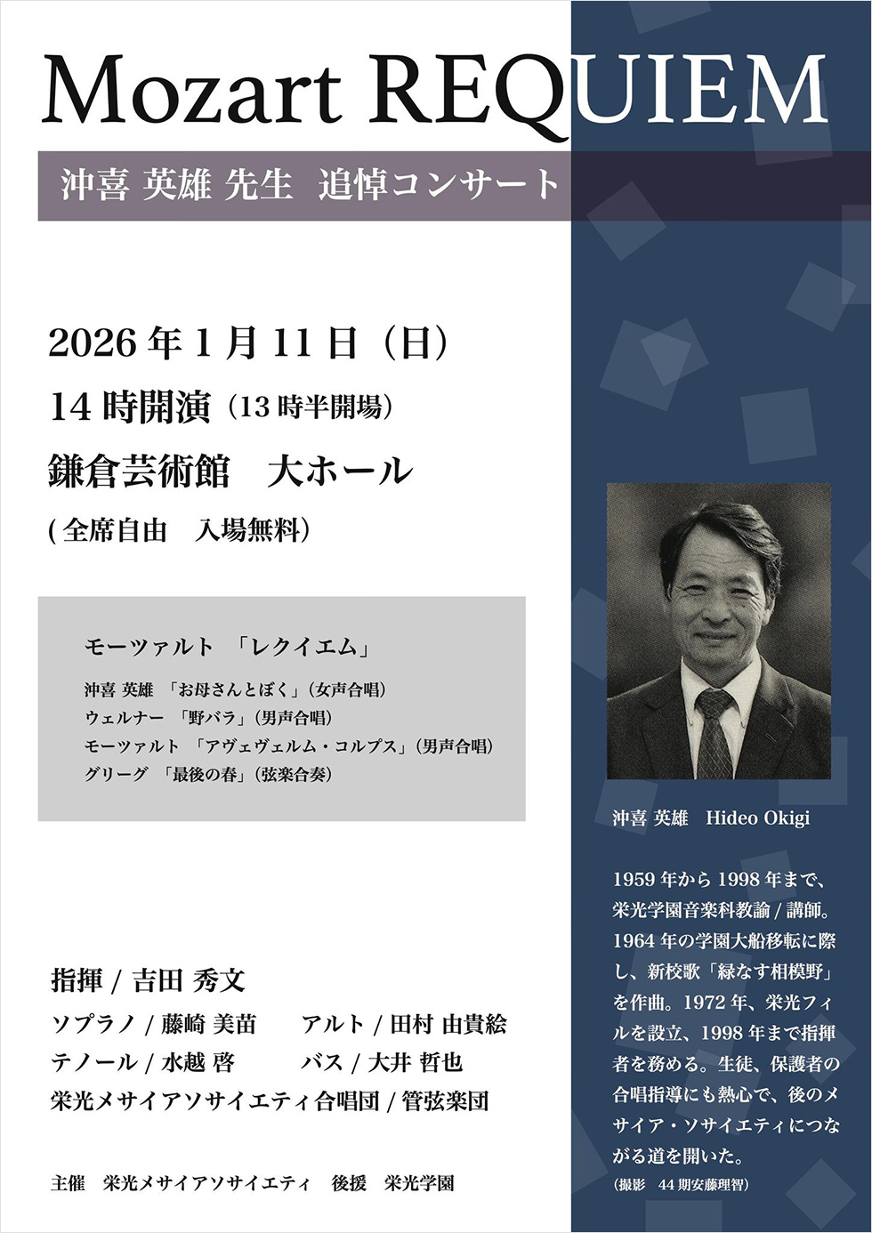 ALUMNI 102号でお知らせしました通り、1959年から1998年まで音楽科の教鞭をとられた沖喜英雄先生を追悼する演奏会を、2026年1月11日(日)に鎌倉芸術館で開催します。同窓生の皆様、お誘いあわせの上、是非、お越しください。