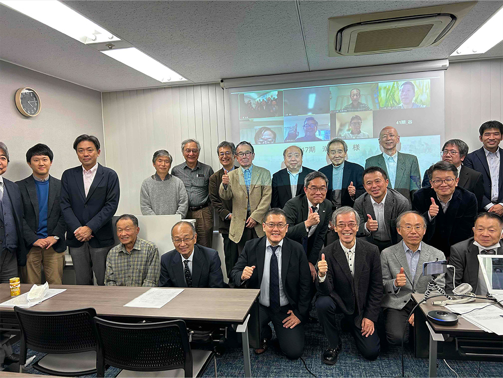 講演会終了後、やはり今回関西支部に加入の47期潮見茂氏の自己紹介、スクリーンショットも併用の参加者の集合写真撮影、金澤和夫支部長による中締めをもって、6期(久保義弘氏)から53期(春江幹事)までの、会場参加25名・zoom6名の集った会は終了しました。