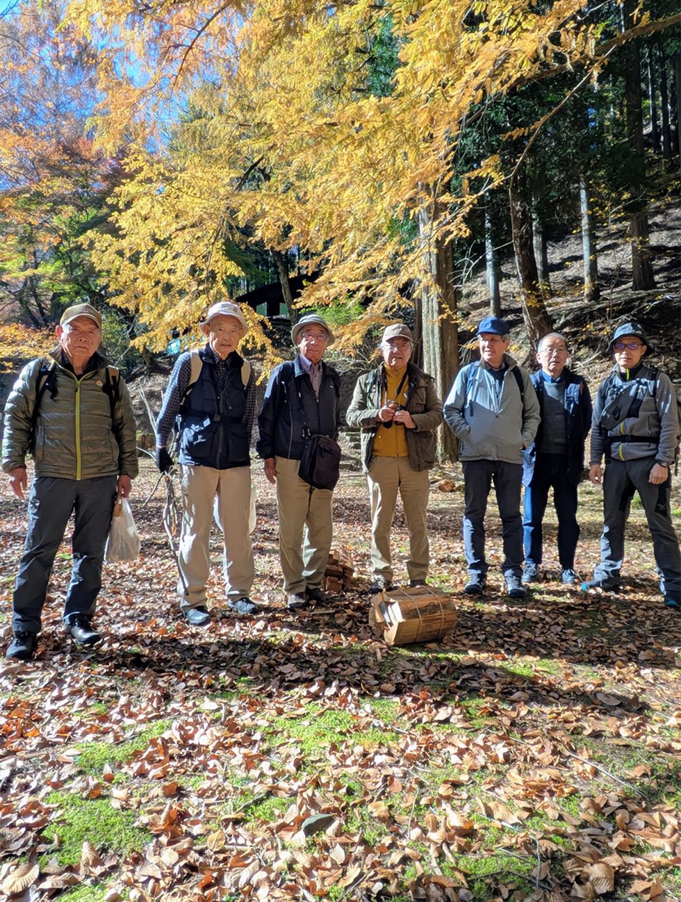 山小屋前の広場の周囲はモミジやカエデが赤や黄色に色づき、メタセコイヤの葉が何とも言えない黄金色に輝いていました。今回はここで記念撮影となりました。