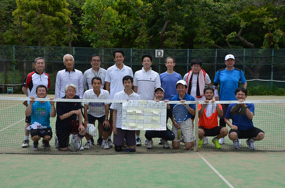 テニスの部は、テニスコート4面を使い4ゲーム先取のダブルス4試合を3ラウンド繰り返しました。各ラウンド8人で4ペアを作り、毎回ペアを組み替えながら3ラウンド、延べ12試合の勝ち数で勝敗を競いました。