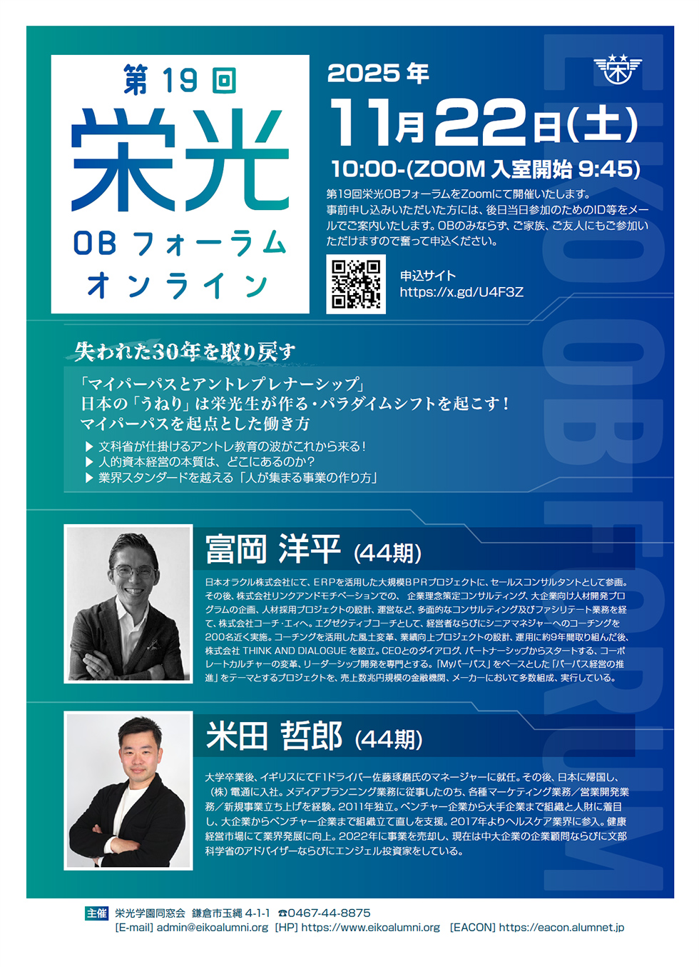 第19回栄光OBフォーラムをZoomにて開催いたします。